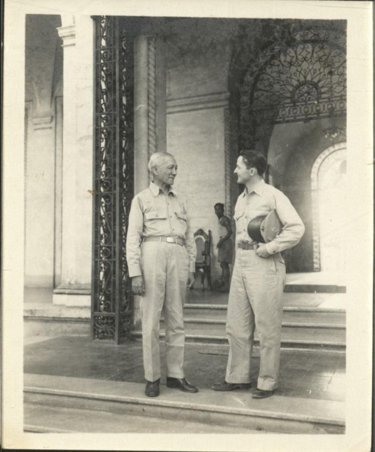 Subject: Philippine president Sergio Osmena talks with a U.S. officer at the entrance to Malacanang Palace after its liberation. This building, known as Kalayaan Hall, now houses the Presidential Muse