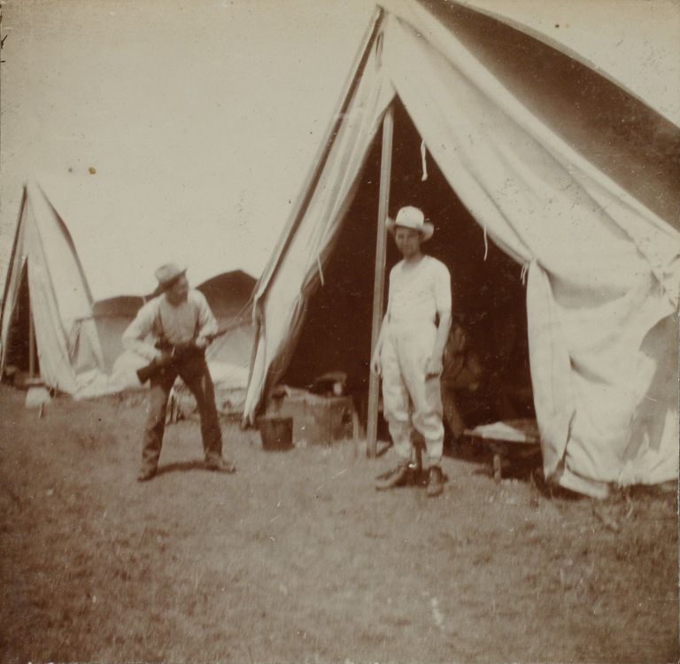 [Untitled - Play-acting outside a U.S. Army tent].