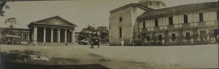 Subject: Plaza Goiti (now Plaza Lacson) in the Santa Cruz district of Manila, with Santa Cruz Church on right and Monte de Piedad Building on left.