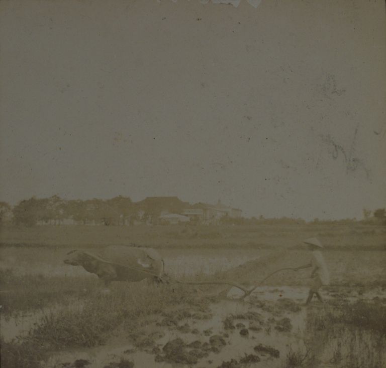 Subject: A Filipino farmer uses a carabao to plow a very muddy rice paddy. See also OFI-000288.