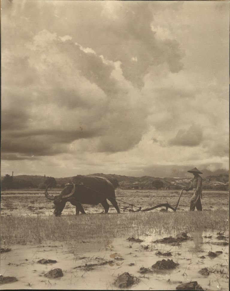 Subject: A Filipino farmer uses a carabao to plow a very muddy rice paddy. See also OFI-002169.