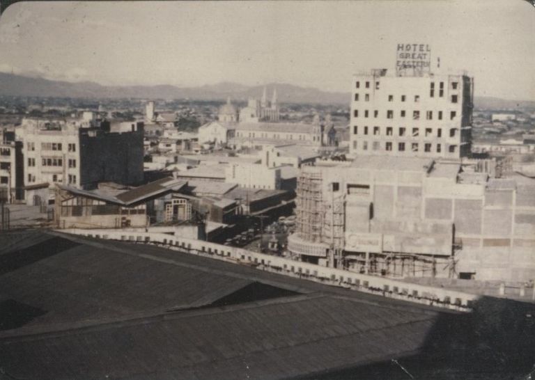 Subject: View looking west over Quiapo district, Hotel Great Eastern on Calle Echague on right, to its left the Quiapo Church, with the tall spires of San Sebastian Church seen in the distan