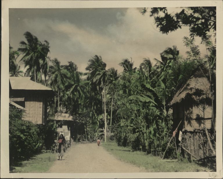 Subject: A road through a Philippine village with nipa huts on both sides, two Filipinos, a coconut palm and banana plants.