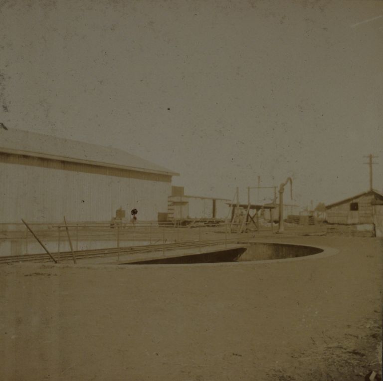 Subject: A difficult image to interpret, but the concrete pit with rail tracks over it would suggest this is a repair or maintenance yard for rail cars or locomotives.