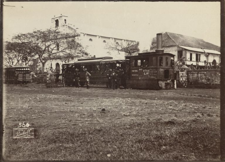 Subject: U.S. soldiers pose in and around a steam locomotive and 2 passenger rail cars of the Manila-Dagupan line in front of San Roque Parish Church at Caloocan. The captured trains were