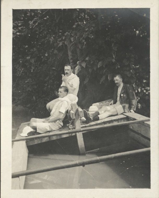 Subject: Three expatriate men, possibly rowers with their oars (see OFI-002396) relax on a floating dock on the San Juan River, in San Francisco del Monte which is now part of Quezon City. Although th