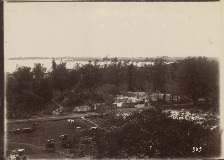 [Untitled - Remains of burned structures (?) near a bay].