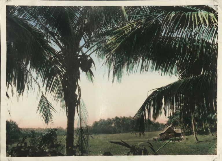 [Untitled - Rice paddies and nipa house seen through palms].