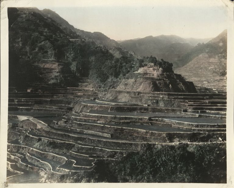 Subject: Nice view of terraced rice paddies as seen across a valley in mountainous country in Northern Luzon.