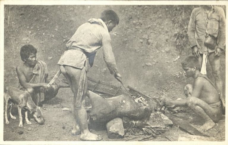 Subject: Four indigenous Philippine men and a dog around some animal (pig or a dog) roasting on a small open fire. See also OFI-002663.