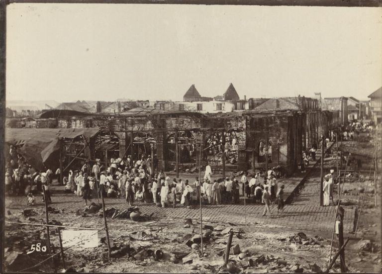 Subject: Crowd gathers next to the burnt ruins of a market building in Manila. A real photograph print of an image also seen in halftone format (see OFI-003297).