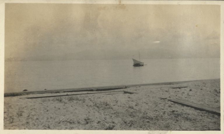 Subject: A a local sailboat sits in a bay just offshore. Perhaps this is Grande Island in Subic Bay or in Manila Bay. See also OFI-004591 and OFI-004592.