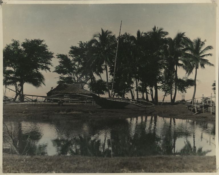 Subject: A river parallels the seashore in a Philippine fishing village. The outrigger boat with sail is a standard Philippine craft.