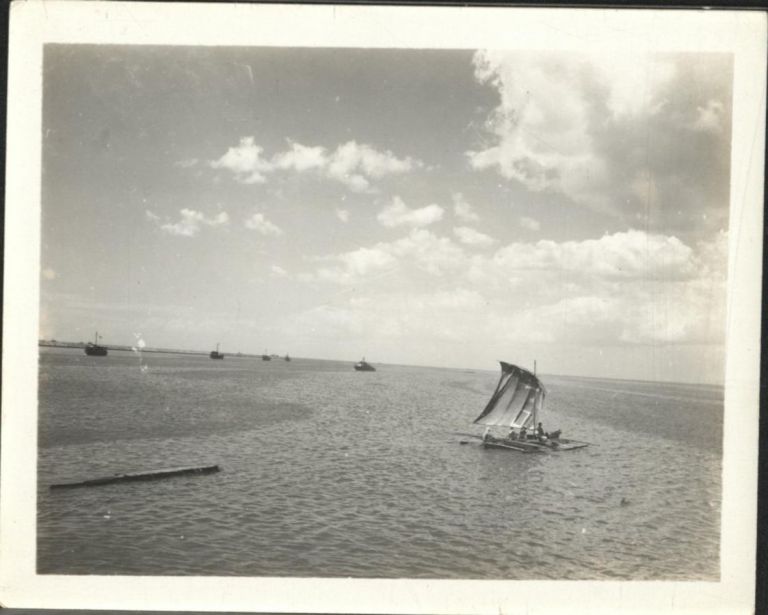 [Untitled - Sailing outrigger and U.S. Navy patrol boats at the mouth of Pasig River, Manila Bay].