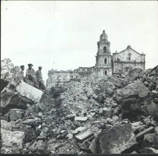 Subject: Damaged Recoletos Church seen behind rubble and destruction caused by the Battle for Manila, February 1945. The church in Intramuros was famous for its four-story bell tower and its magnifice