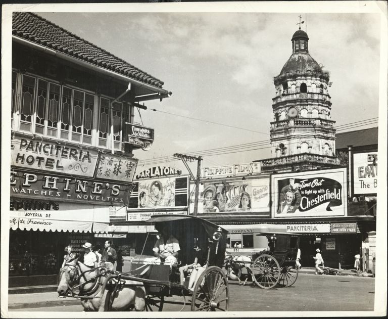 Subject: Busy street scene of shopping district in Santa Cruz, Manila, with the bell tower of Santa Cruz church dominating. The movie on the marquee of Filippine Films, "Sakay," was judged best film o