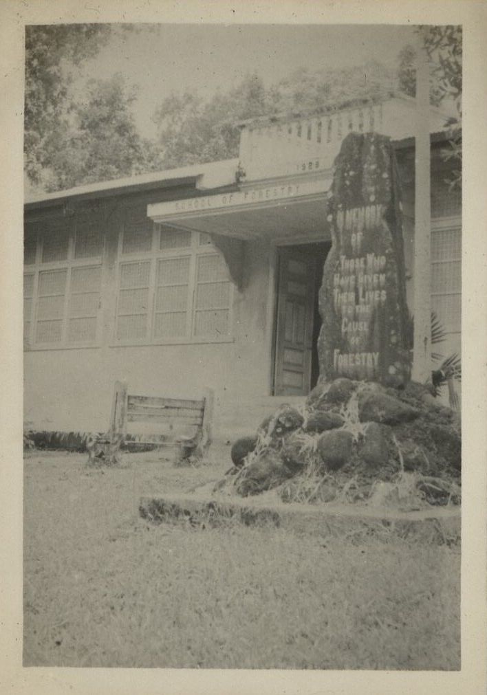 Subject: The front of the School of Forestry building (1928) at U.P. - Los Banos. The memorial reads: "In memory of those who have given their lives to the cause of forestry." OFI-004987 to OFI-005005