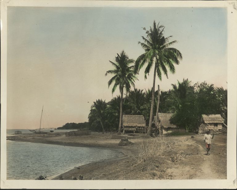 Subject: A Filipino man carries a bamboo pole on his shoulder on a path along the seashore, with nipa huts of a fishing village behind him.