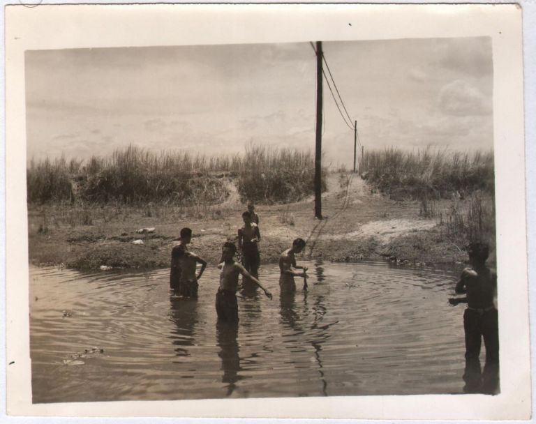 [Untitled - Shirtless men cool off in a river].
