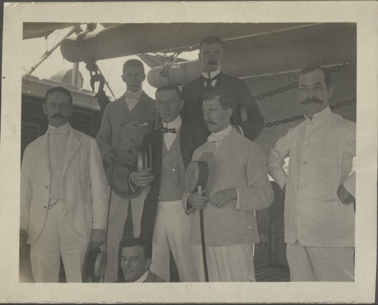 Subject: Six expatriate men pose for a group photo, apparently on board a ship, given the chains and tackle.
