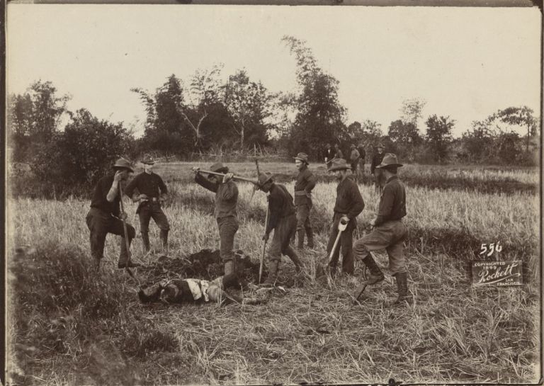 Subject: U.S. soldiers with pick and shovels dig a grave for a dead Filipino soldier in the field. See also OFI-002635 for this same image as a halftone print.