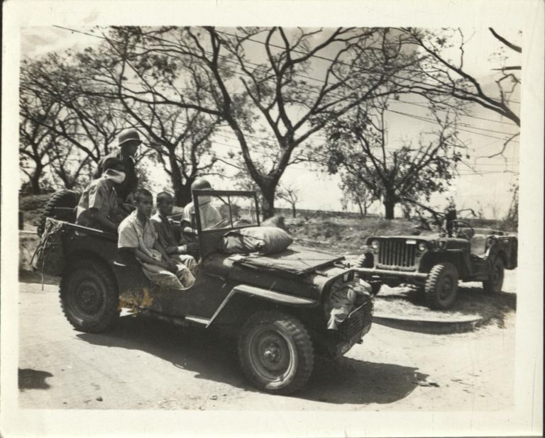 Subject: U.S. soldiers in jeeps evacuate wounded civilians to Army aid stations in Manila during the battle for liberation in February, 1945.