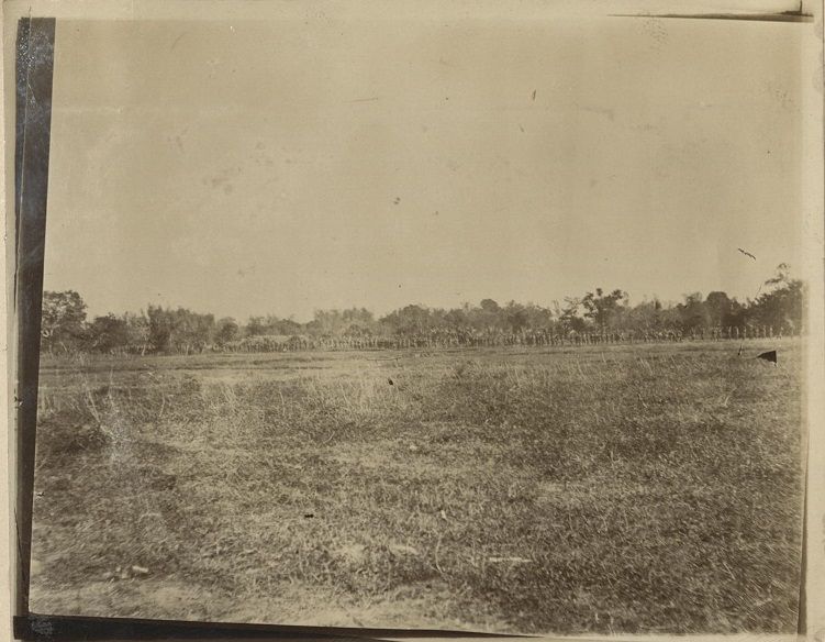 Subject: Barely visible are a row of American soldiers marching along the treeline at the edge of this field.