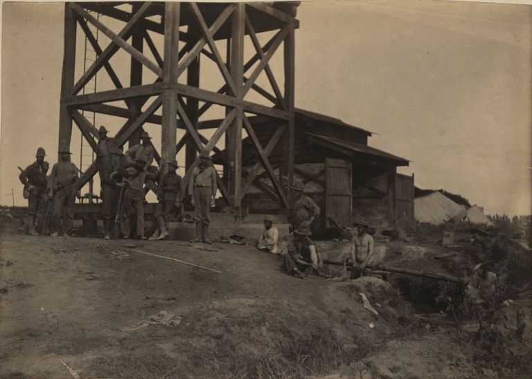 [Untitled - Soldiers stand around wooden structure and water pipe - watchtower?].