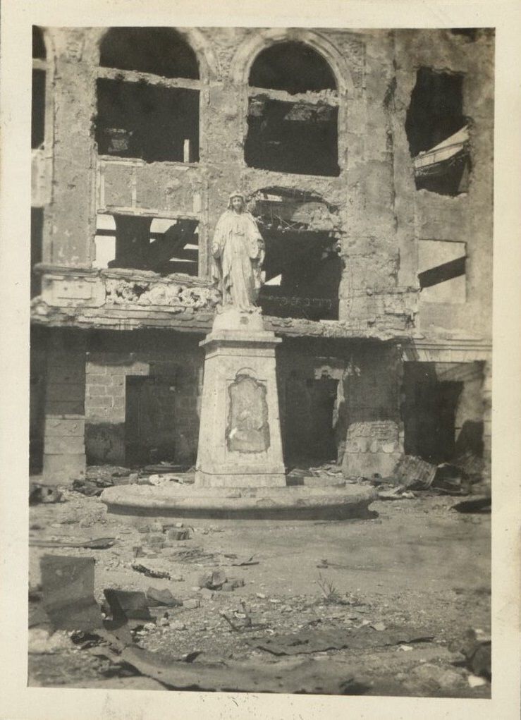 [Untitled - Statue in courtyard of destroyed college or church].