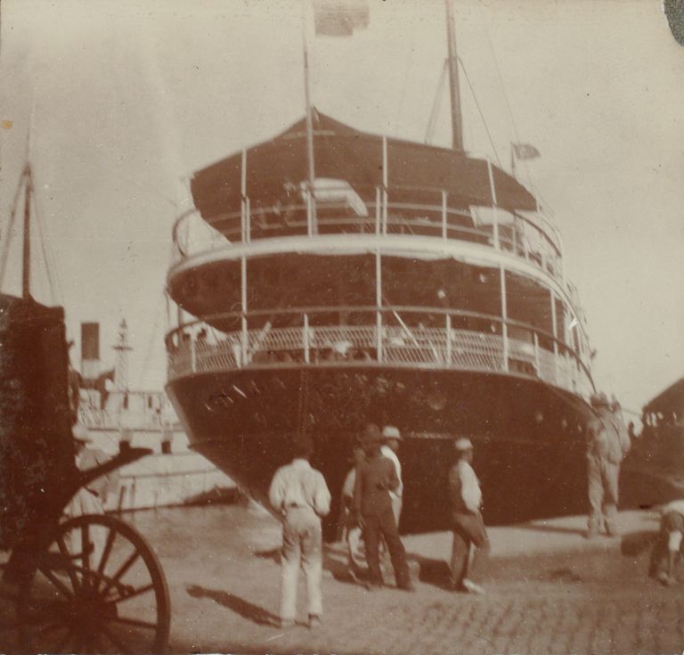 Subject: A steamship is docked at a wharf, perhaps in the Philippines or elsewhere. A monument appears in the background but doesn't appear to be either Anda or Magallanes monumnets in Mani