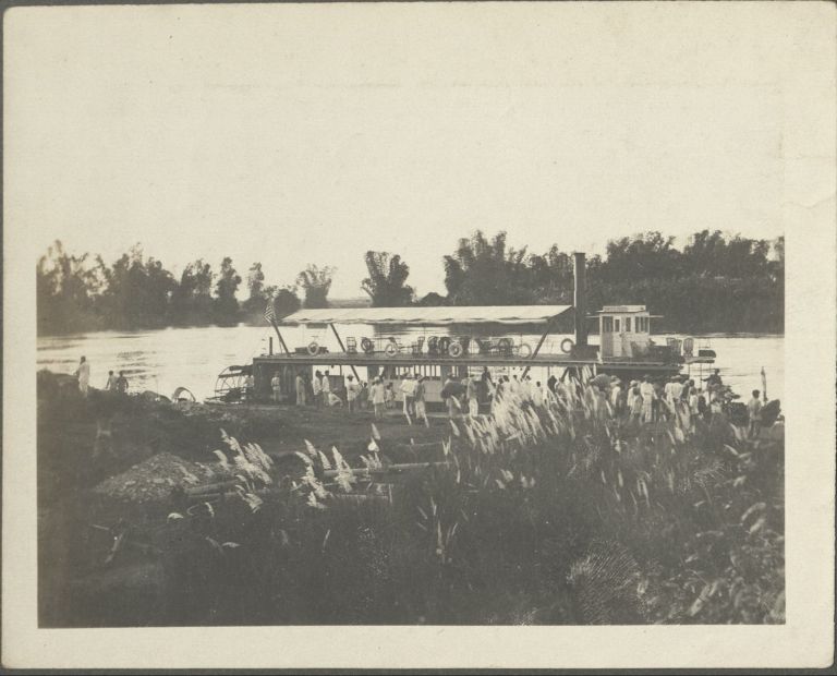 Subject: A sternwheel riverboat (also called a paddle steamer) discharges passengers at a river landing. Perhaps this is the awaited event in OFI-002405 and OFI-002360. See also OFI-002421 where a ver