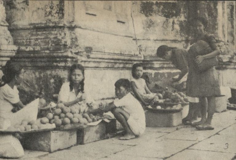 Subject: Young Filipinos buy and sell produce on a street outside a large building (church or government office) that shows the scars of age, war damage, or both.