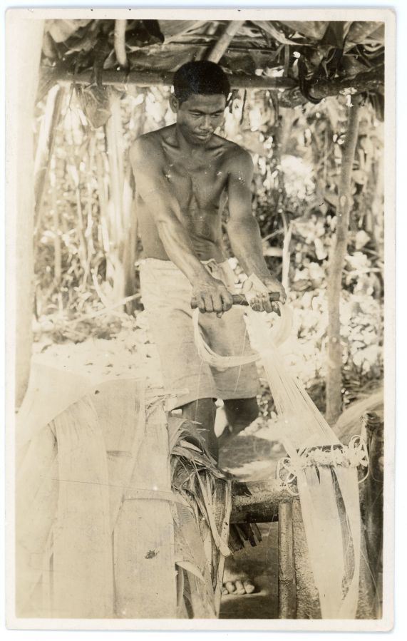 Filipino man pulling hemp fibers from leaves in a shed. Same image as ROJR-001382.