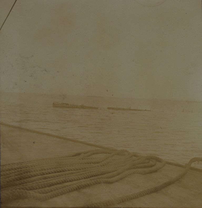 Subject: A pier or wharf with a hawser (thick rope used for mooring a ship) and a sunken ship, probably a Spanish casualty of the Battle of Manila Bay (1898). Probably in Cavite.