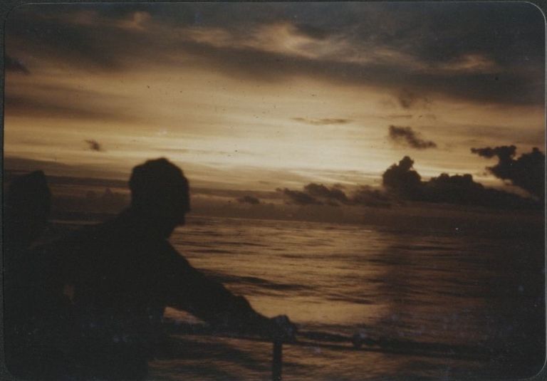 Subject: Sunset over Manila Bay, possibly taken from on board a ship due to the pattern of the waves.