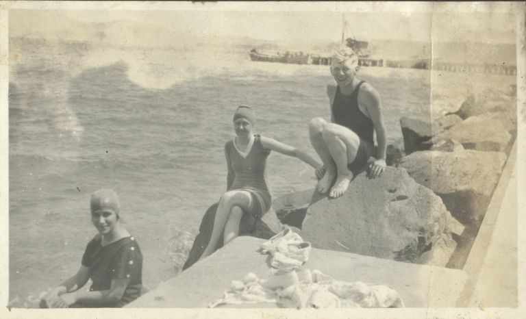 Subject: Americans swimming by pilings of an old unused pier. The old pilings indicate this is on Grande Island in at Subic Bay.
