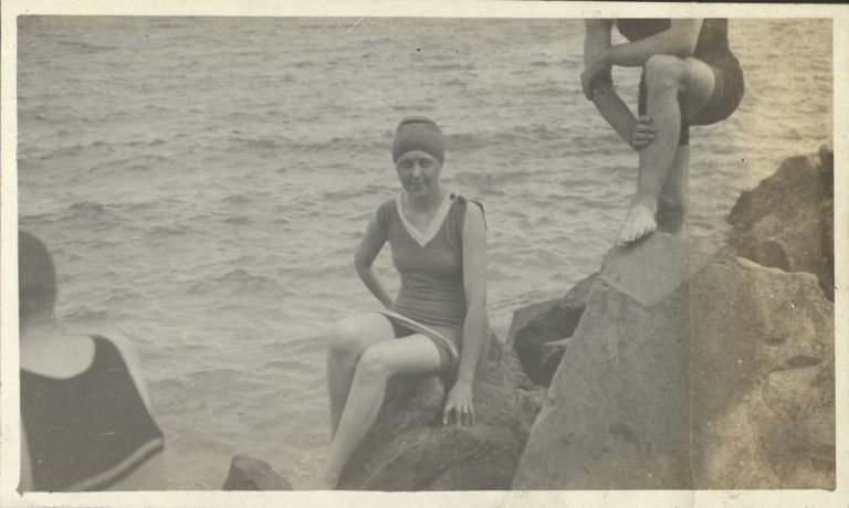 Subject: American military wives at a swimming beach on Grande Island, Subic Bay. The rock may be support for the pier. See also OFI-004631.