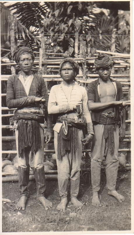 Subject: Three indigenous men, possibly in Mindanao, pose with their hand on the handles of their large sheafed knives, called 'kris.' For more info, see: http://www.morolandhistory.com/05.pg-kris-vs-