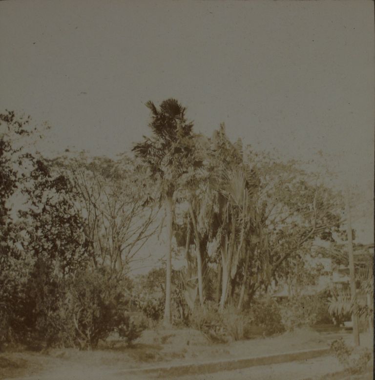 Subject: Seemingly unremarkable clump of trees and palms (including coconut palm and fan palm) by a road. A building is partially obscured far right.