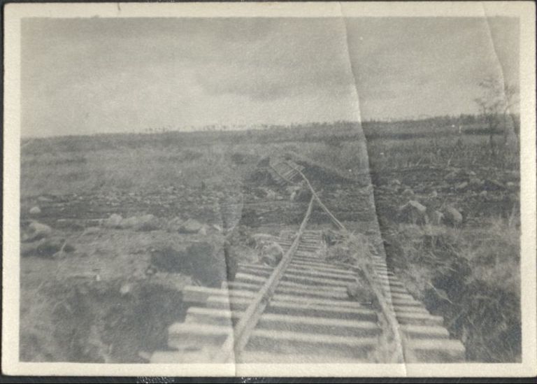 [Untitled - Twisted and broken railroad tracks and ties vanish into a morass of dirt and rocks after a flood or landslide].