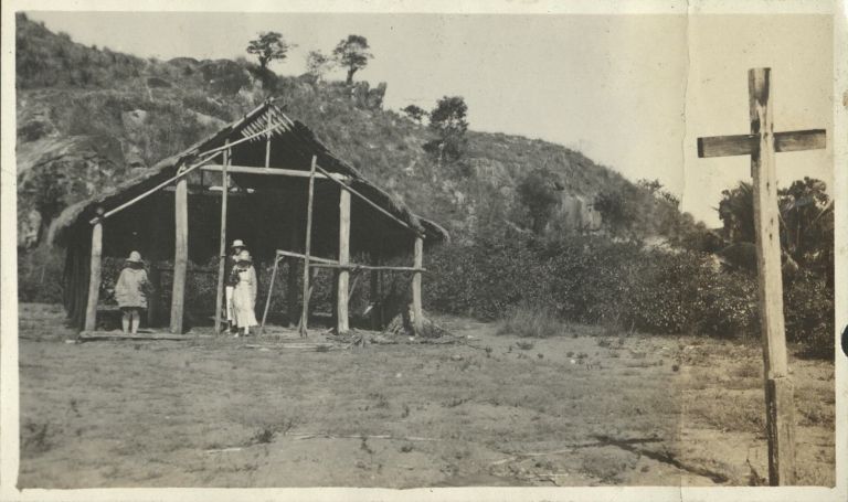 Subject: Is that a village church? Two American women, military wives, explore a structure in a village with a cross outside. Likely near Subic Bay.