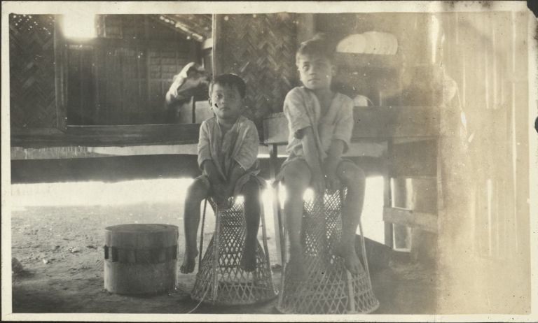 Subject: Two boys sit on woven baskets (they may be fish traps rather than stools) under a house. Probably near Subic Bay.