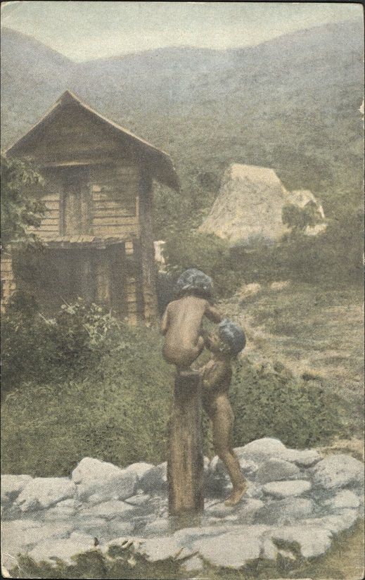 Subject: Two indigenous children play around a pole (marking a mountain spring?) in front of a house in the mountains of Northern Luzon. On back: "Copyright 1917, by Mission of Saint Mary the Virgin,