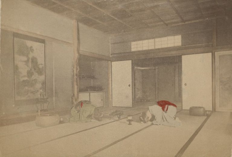 Subject: Two Japanese women bow and kneel in a washitsu or traditional Japanese-style room with tatami flooing. Probably depicting a tea ceremony.
