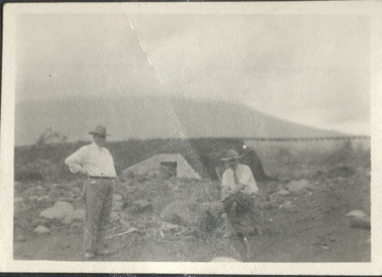 [Untitled - Two men pose near ruined railroad tracks and washed-out bridge after a flood or landslide].