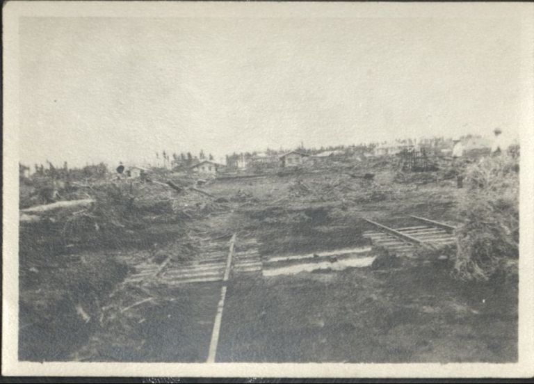 [Untitled - Two sets of washed-out railroad tracks lie amid mud and trees after a flood or landslide].