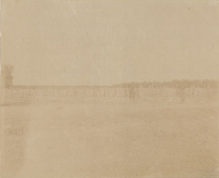 Subject: A terribly faded print showing two American soldiers leaning against a split-bamboo fence in a field.