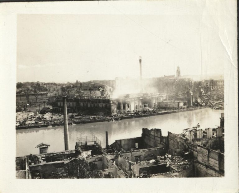 Subject: Fighting along the Pasig River in Manila during the battle for liberation in February, 1945. Here the government ice plant burns. The clock tower of city hall is visible to the right.