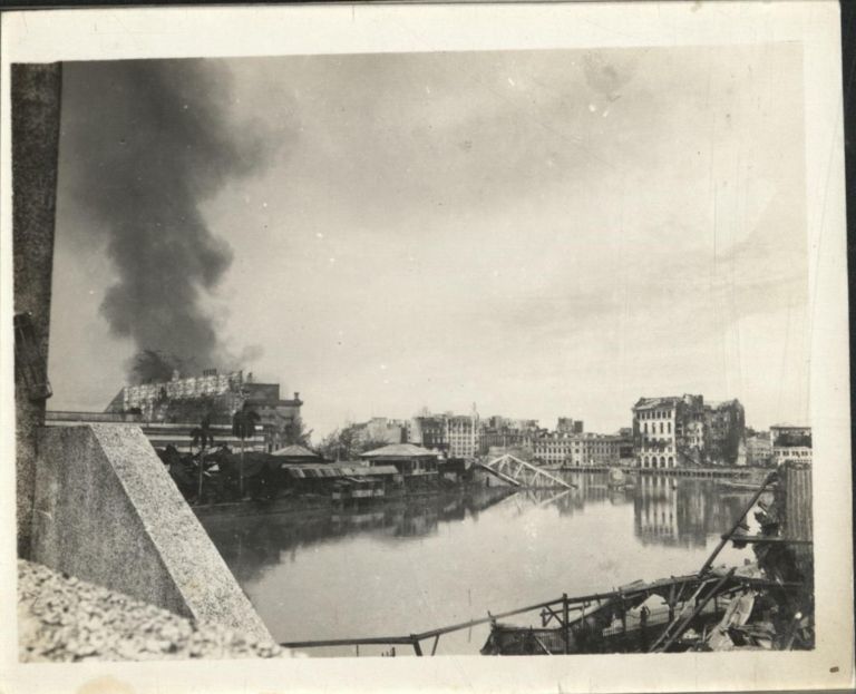 [Untitled - Urban warfare in Manila during liberation, buildings burning across Pasig, February 1945].
