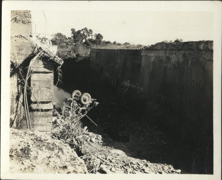 Subject: Destruction in Manila during the battle for liberation in February, 1945. Here a truck lies upside down in a big hole, perhaps the moat at Fort Santiago.